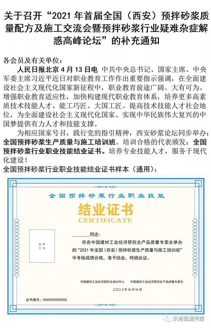 關于舉辦“2021年首屆全國(西安)預拌砂漿質量配方及施工交流會暨預拌砂漿行業疑難雜癥解惑高峰論壇”的通知
